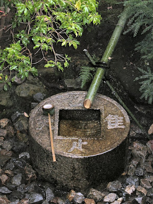 Stone water basins (tsukubai) were originally placed in gardens for visitors to wash their hands and mouth before the tea ceremony. The water is provided to the basin by a bamboo pipe, or kakei, and they usually have a wooden ladle for drinking the water. In tea gardens, the basin was placed low to the ground, so the drinker had to bend over to get water.